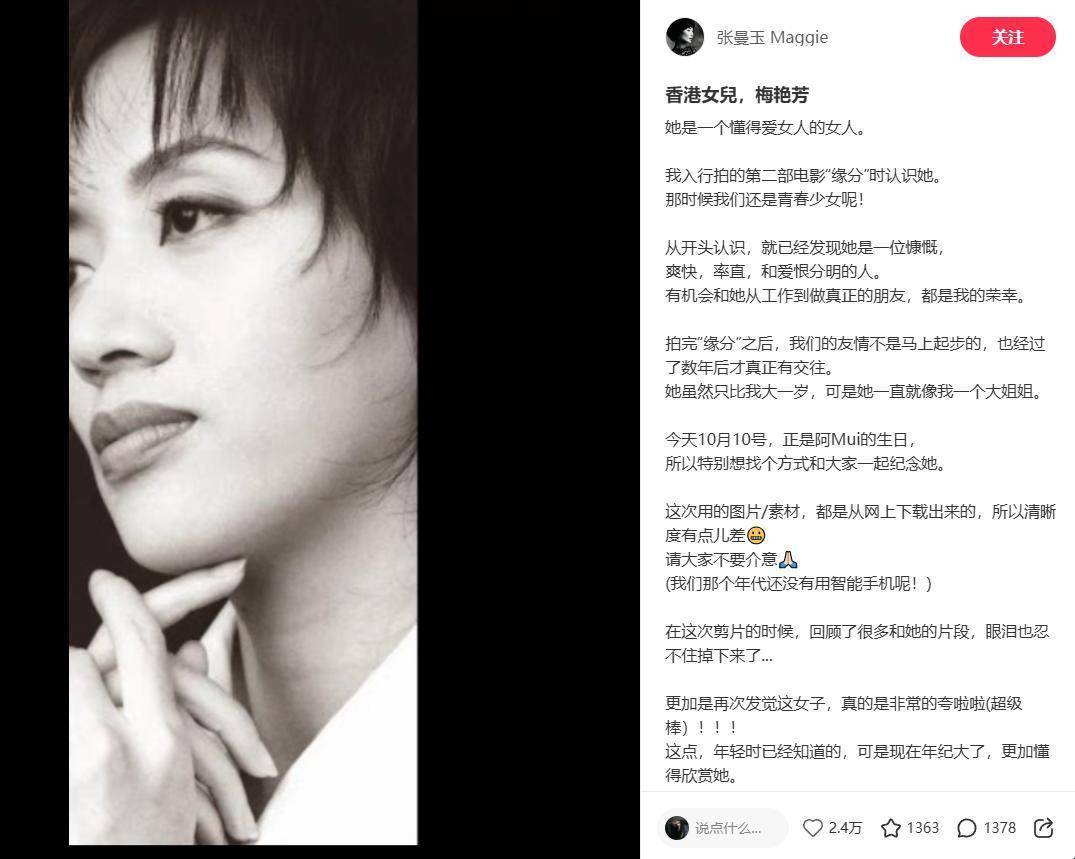 10日是梅艳芳的生日,而在这一天张曼玉也发文回忆自己和梅艳芳的过往,还分享了剪辑视频怀念对方的片段。